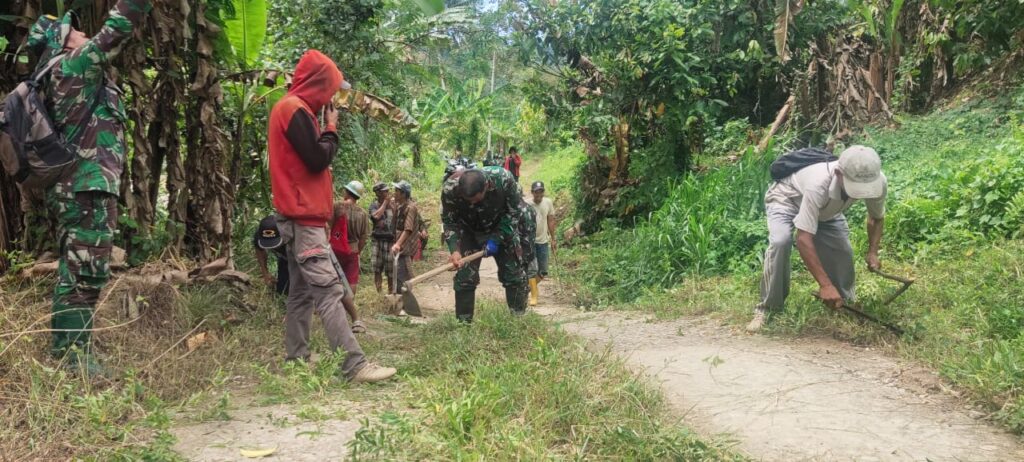 Polman - Sejumlah anggota TNI dari Koramil 1402-02/Wonomulyo bersama masyarakat melakukan karya bakti pembersihan lingkungan dan jalan desa.