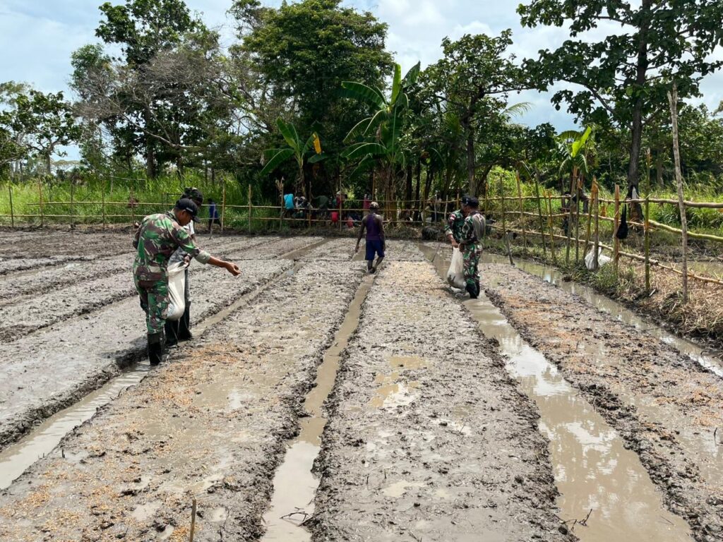 Lettu Inf Syukri dengan beberapa personel Pos Kondo lainnya bersama warga turun ke sawah melakukan penggemburan tanah yang dipersiapkan untuk penyemaian bibit padi.