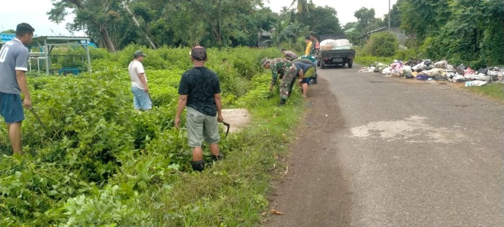 TAKALAR - Wujud Kepedulian Personel TNI dari Koramil 1426-05/Marbo Kodim 1426/Takalar bersama warga melaksanakan kerja bakti pembersihan saluran air dan rumput liar yang tumbuh menutupi pinggir kiri kanan jalan di Desa Banggae Kecamatan Mangarabombang Kabupaten Takalar, Jum'at (8/3/2024).
