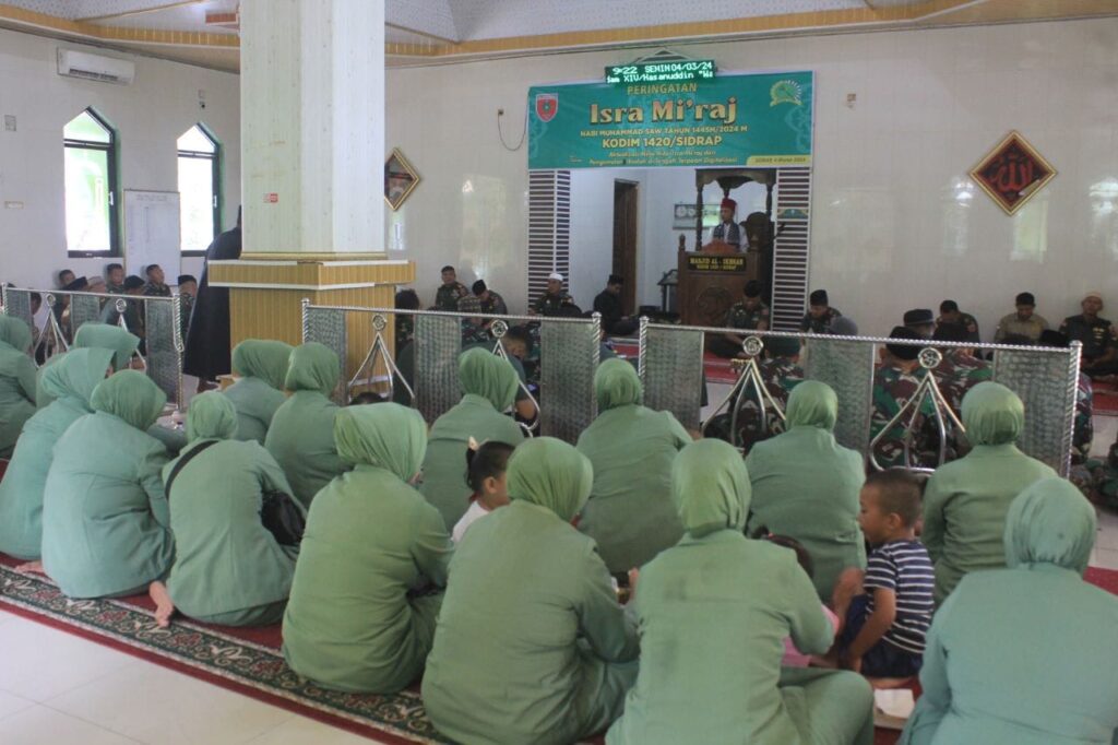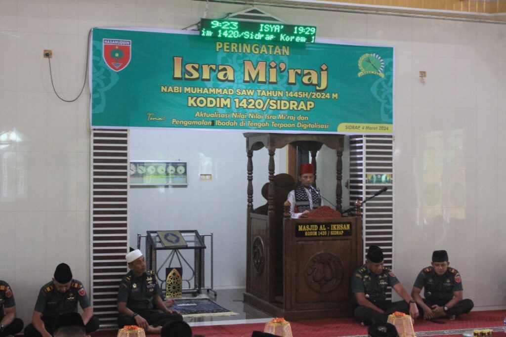 SIDRAP - Komando Daerah Militer 1430/Sidrap menggelar acara peringatan Isra’ Mi’raj Nabi Muhammad SAW 1445 H/2024 M yang dilaksanakan di Masjid Al Ikhsan Makodim 1420/Sidrap Jalan Jenderal Sudirman Kelurahan Majelling Wattang Kecamatan Marittengae Kabupaten Sidenreng Rappang, Senin (04/03/24).
