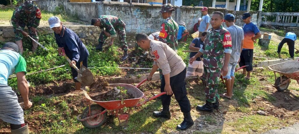 Konawe _ Koramil 1417-12/Soropia melaksanakan Karya Bakti bersama masyarakat dan instansi terkait di Desa Leppe, Kec. Soropia, Kab. Konawe, Rabu (13/3).