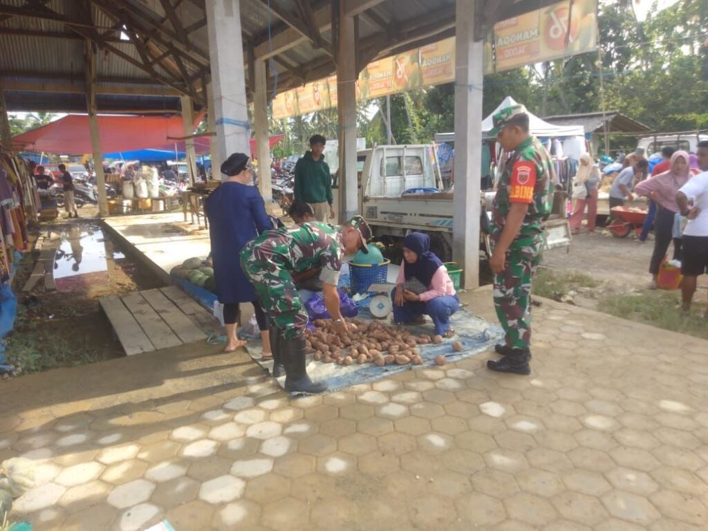 KONUT — Babinsa Koramil 02/Asera Kodim 1430/Konawe Utara Serka Asmadi, Sertu Sopi’i dan Serda Anghar melaksanakan pemantauan dan perkembangan harga bahan pokok (Sembako) di pasar tradisional Kec.Lembo Kab.Konawe Utara, Jumat (08/3/2024).