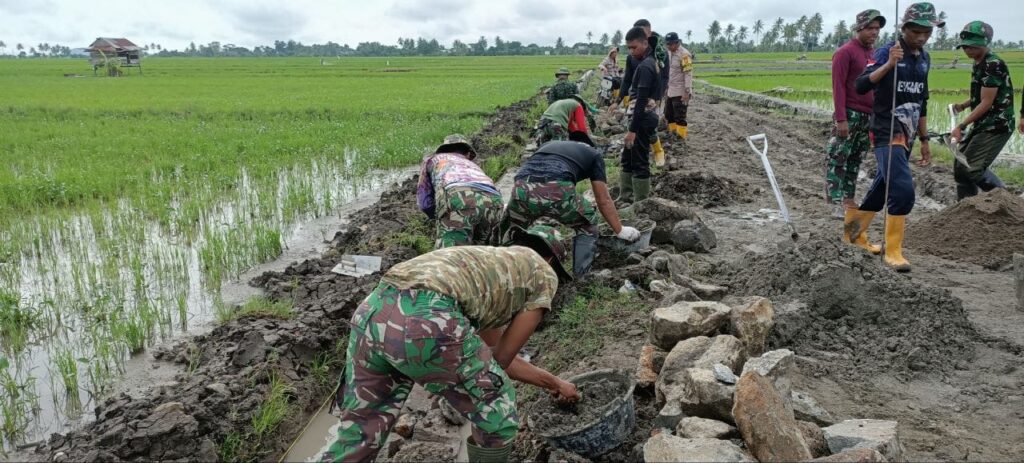 Pinrang_ Semangat personel Satgas TMMD ke-119 Kodim 1404/Pinrang bersama warga tidak perlu diragukan dalam memacu progres pengerjaan sasaran fisik di Dusun Kapa Desa Siwolong-polong Kecamatan Mattiro Sompe Kabupaten Pinrang Provinsi Sulawesi Selatan, Senin (04/03/2024).
