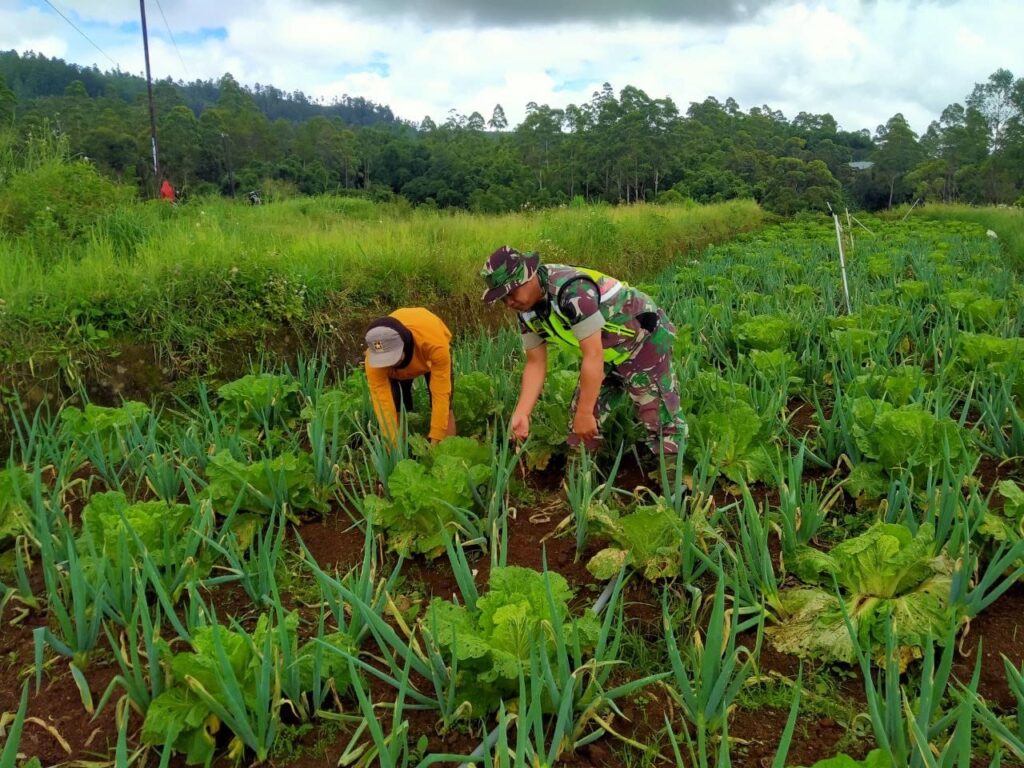 SINJAI. Babinsa Desa Arabika Koramil 1424-02/Sinjai Barat Kodim 1424/Sinjai Serda Ardan melaksanakan kegiatan pendampingan Hanpangan kepada petani yang sedang melaksanakan panen sayur jenis Bawang bertempat di Dusun Kasuarang Desa Arabika Kec. Sinjai Barat Kab. Sinjai, Kamis (07/03/2024)