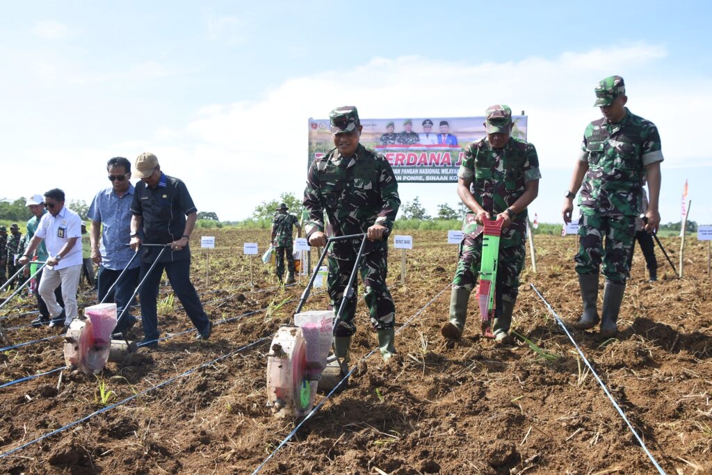Watampone - Komandan Korem 141/Toddopuli Brigjen TNI Sugeng Hartono, S.E., M.M. memimpin seremonial Penanaman Perdana Jagung, pohon sukun dan pelepasan bibit ikan nila secara serentak dalam rangka Ketahanan Pangan Terpadu Korem 141/Tp di area HGU milik PTPN Arasoe Desa Bolli Kec. Ponre Kab. Bone Provinsi Sulsel, Kamis (07/03/2024).